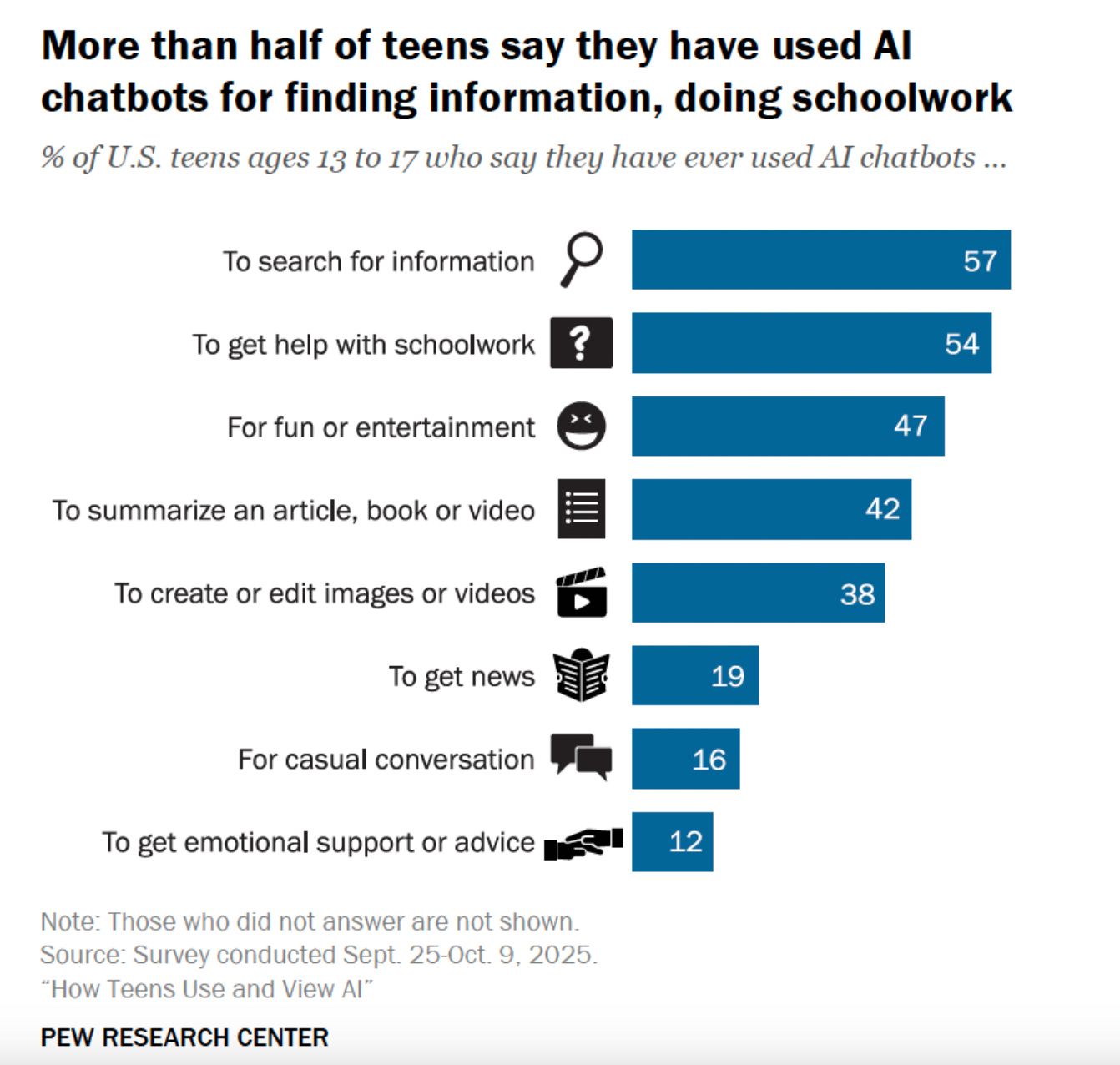 A majority of teens (just over 50%) say they are using chatbots to find information and help with schoolwork.