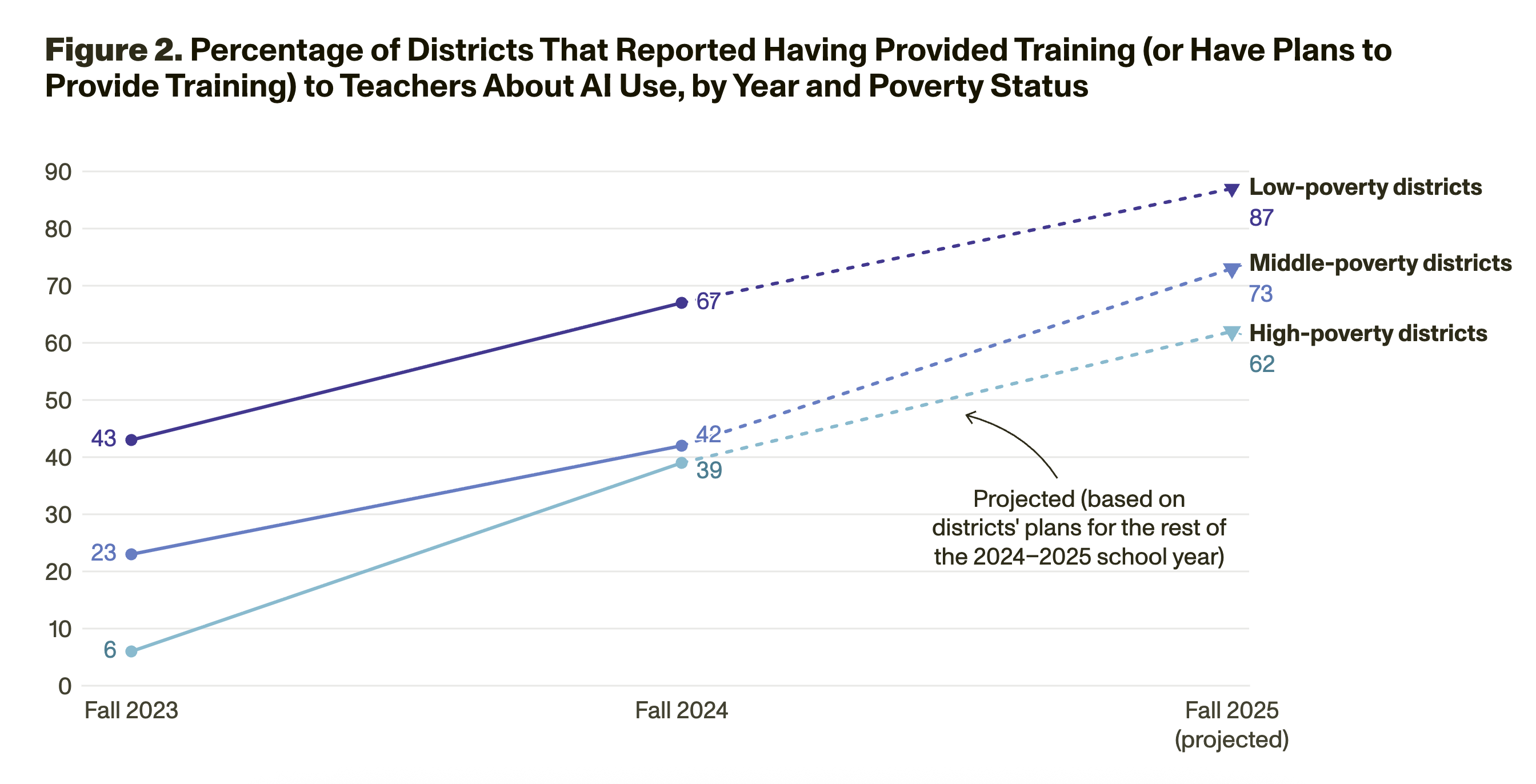 Securly also flags inappropriate student use. Only 2% of interactions were flagged, and the vast majority (95%) of these were students trying to use AI to complete their work. Other violations involved games, sexual content, firearms, gambling, drugs, and hate. Securely’s CEO said that students will test boundaries, but if districts put policies and guardrails in place, then most students will abide by them.